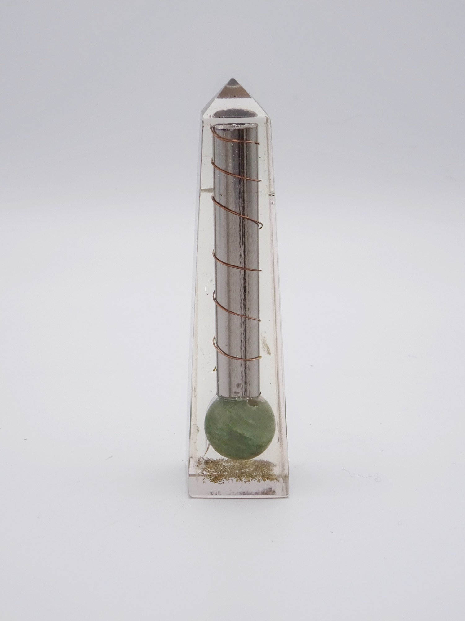 Un obelisco de orgonita con aventurina verde combina dos elementos de fuerte carga simbólica y energética: la forma del obelisco, la orgonita como generador de energía, y la aventurina verde como piedra con propiedades específicas.