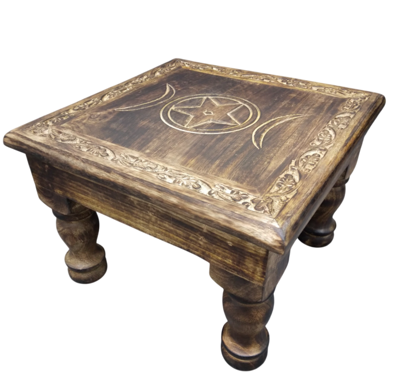 Eleva tu práctica espiritual con la Mesa de Altar Triple Diosa, también conocida como Triple Luna. Confeccionada en madera de mango de alta calidad.