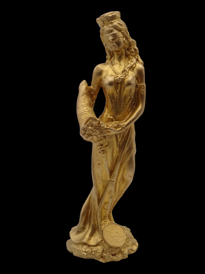 La Diosa de la Fortuna representa la diosa de la riqueza, la fortuna y la prosperidad. Sostiene el cuerno de abundancia en sus manos, del cual vierte generosos regalos y con una base de monedas a sus pies símbolo de prosperidad, mientras que sus ojos vendados simbolizan el no favoritismos de cómo entrega sus regalos.